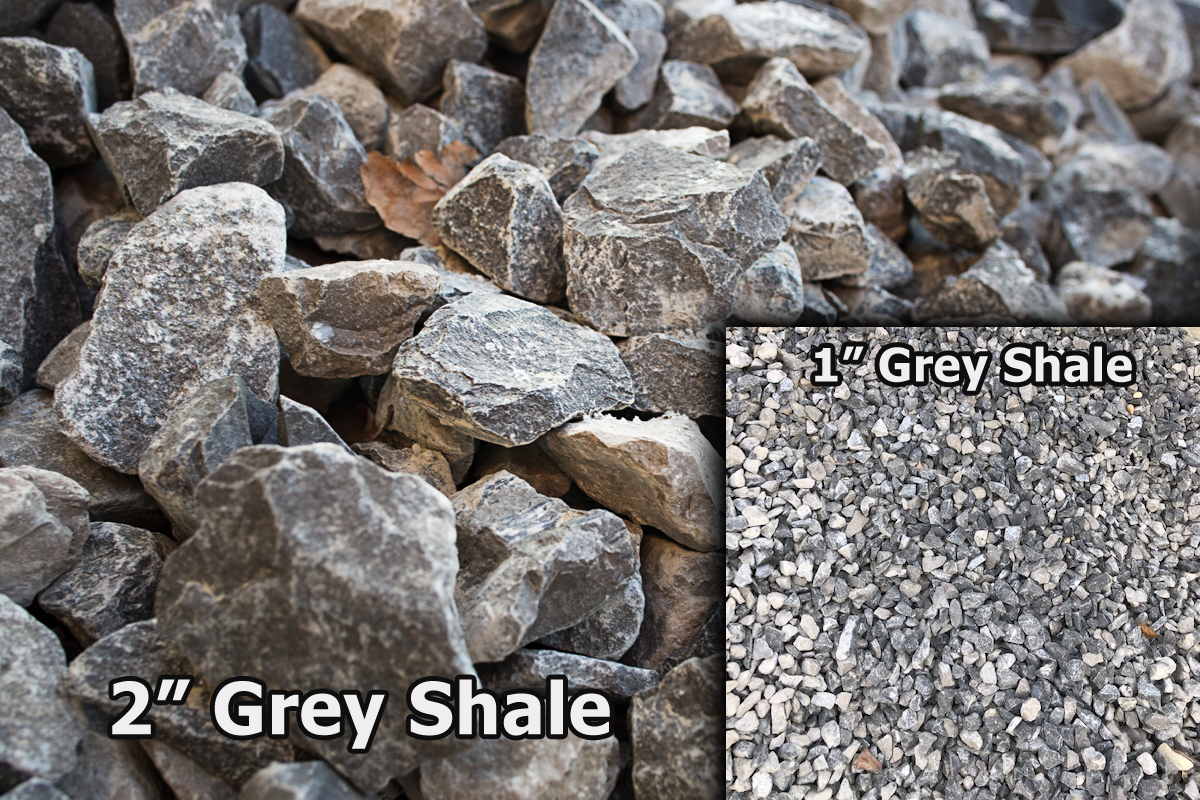 Grey shale is a popular decorative rock product for landscaping, driveways, and walking paths. We have 1" and 2" grey shale in stock and ready for pickup or delivery in the area.